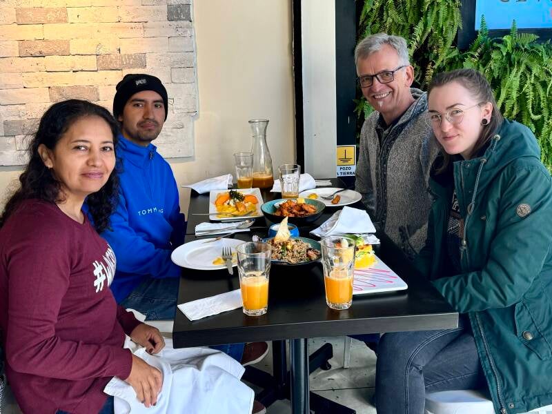 Ein letzter Eindruck: César bringt mich mit seiner Familie zusammen. Er führt mich in die Wohnung der Mutter, mit der wir von dort aus essen gehen. Und lädt am nächsten Morgen seinen Bruder mit Familie zum Frühstück ein. Das weitet den Blick und gibt interessante Gespräche, zumal mit der 27 jährigen Nichte, die inzwischen als Ärztin arbeitet. Sie meldet sich am Nachmittag und bietet mir an, meinen inzwischen chronifizierten Husten zu untersuchen.Ein netter Zug, zumal ich auch schon an einen weiteren Arztbesuch gedacht hatte, weil dieser Husten überhaupt nicht rückläufig ist. Also hört sie mich ab und wir unterhalten uns über die Röntgenaufnahme aus Lima. Anschließend werden die „Untersuchungsergebnisse“ im Familienkreis diskutiert, was irgendwie ganz lustig ist. Ergebnis: keine Lungenauffälligkeiten, offensichtlich eine zähe Bronchitis,vielleicht auch ein bisschen Covid, aber dazu passen die Symptome nicht.