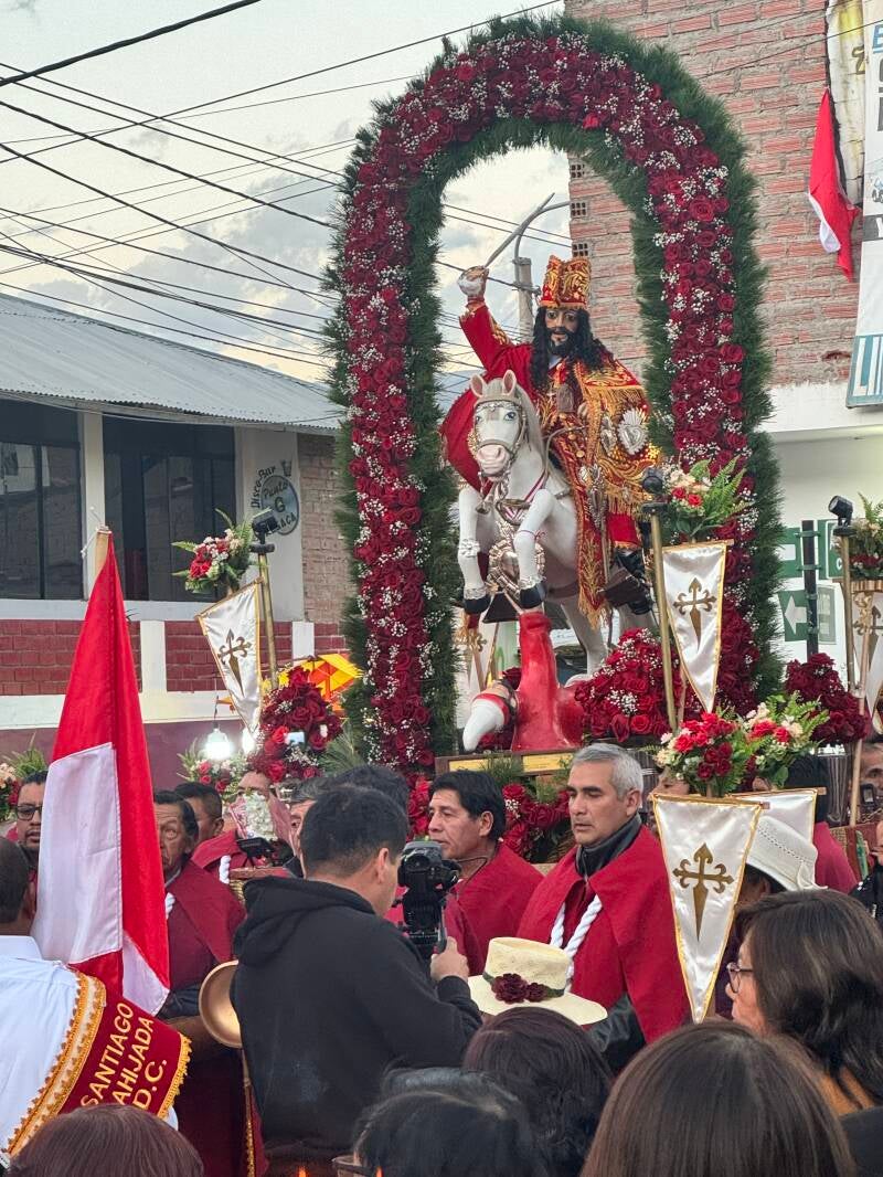 Hier sind wir mitten in der Fiesta des Dorfes angekommen. Es ist das Fest des Jahres: Fest des Apostels Jakobus (Santiago) am 25.7.. Alle Familenmitglieder kommen aus aller Welt nach Hause, um dieses Fest mitzufeiern. Organisatorisch wird ein „MAJOR DOMUS“ bestimmt, der - ein Mal in seinem Leben - das ganze Fest bezahlt. Manche nehmen dafür einen Kredit von bis zu 100 000 Soles auf. Dass das Fest einen religiösen Rahmen hat (es gibt jeden Tag eine Misa) , ist eher Tradition und gibt dem ganzen Spektakel eine Form. Aber was hier passiert, sind eigentlich Rituale, die die Gemeinschaft feiern und ein umfangreiches Unterhaltungsprogramm bieten: es gibt 3 Musikkapellen, die immer irgendwo spielen und die Leute zum Tanzen auf der Straße einladen. Es gibt jeden Tag irgendwo freies Essen und Trinken. Ab 4:00 laufen Trommler jeden Morgen durch den Ort. Schon in der Nacht werden Salutböller abgefeuert. Irgendwo knallt es immer. Auf der Plaza gibt es am 2.Abend ein Riesenfeuerwerk, das sich mit deutschen Maßstäben messen kann. Und natürlich wird am Höhepunkt des Festes die Statue des Jakobus auf einem geschmückten Gestell durch die blumenbedeckten Straßen getragen.