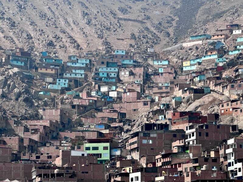 Miguelangel sagt, für die Menschen sei die Alternative, hier oben am Hang zu wohnen oder unten an der vielbefahrenen und dreckigen Straße. Sie ziehen offensichtlich die Höhe vor, auch wenn es wohl Strom, aber nicht unbedingt Wasser gibt.