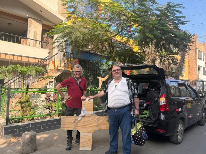 Mit zwei Koffern, 1 Rucksack, 1 Handgepäck und einem Kreuz komme ich heil und nicht unbedingt ausgeschlafen in Lima an. Das Kreuz schippert unbekümmert auf dem Gepäckband herum neben den anderen Koffern, die auf ihre Empfänger warten. Der Zoll will es noch einmal durchleuchten, aber dann stehe ich ohne weiterte Kontrolle vor dem Flughafen und werde von Norbert mit einem herzlichen ”Bienvenidos” empfangen. Und die Kosten für das Sondergepäck “Kreuz” - wurden nicht verlangt. Vielleicht war es den Beamten so skurril, dass sie über die Gebühren hinwegsahen…