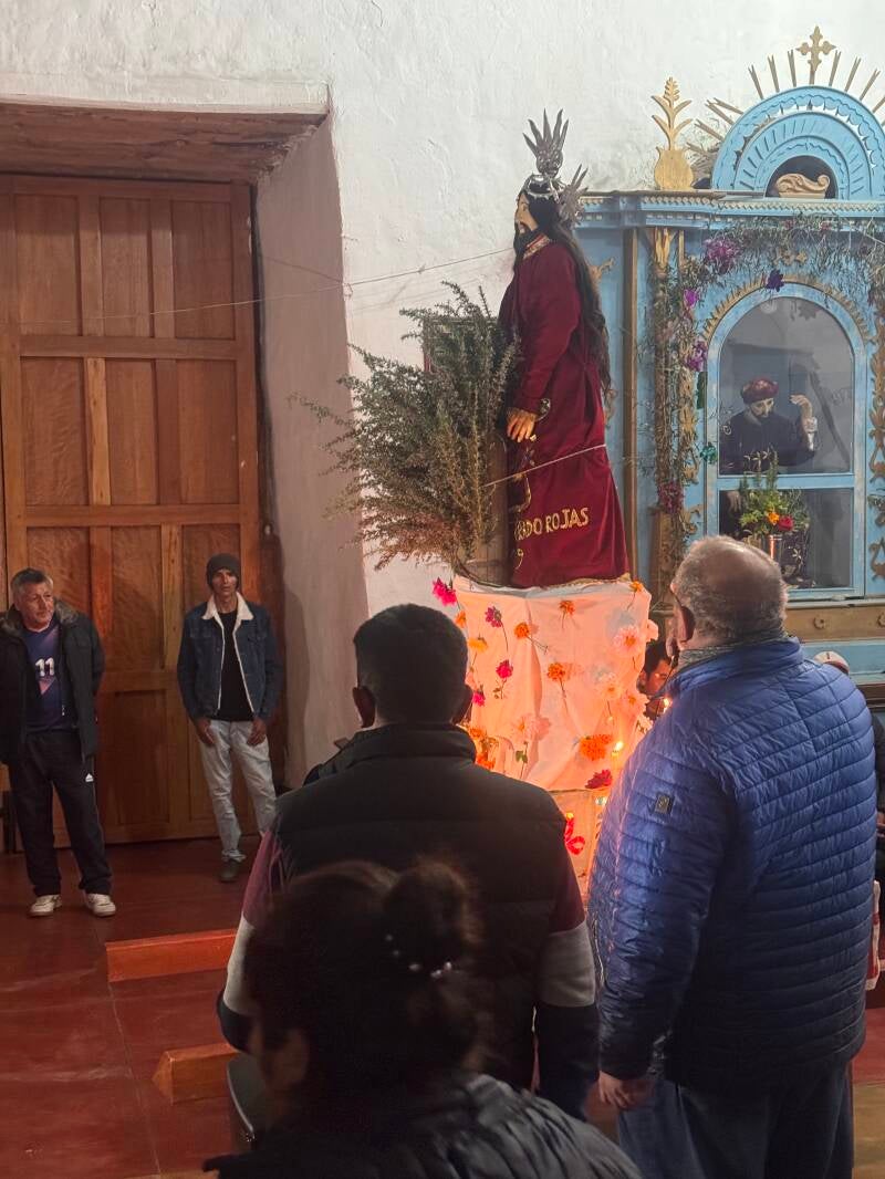 Das ist Jury, der „Oeconomo“ des verlassenen Pfarrhauses und der Kirche.(Später treffe ich seinen über 80 jährigen Vater, der mir offenbart, dass er Jury nach dem Astronauten Jury Gagarin benannt habe. Jury ist für mich der Sheriff bei dieser „Semana Santa“, weil er Herr über Kirche, Pfarrhaus und Prozessionen ist. Er regelt alles und macht allen die Ansage. Sein Spanisch ist sehr quechua-geprägt. Ich verstehe ihn sehr schlecht, aber er sagt uns, wann wir wo zu Mittag essen und versorgt uns mit dem Notwendigsten.